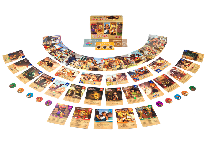 In Gladius, play as cunning Roman spectators trying to make the most money by betting on rigging the gladiatorial games. Each round, players secretly place bets on competing gladiator teams. Through the skillful use of underhanded tactics, players can help and hinder teams to alter the outcome of each battle. The player with the most money at the end of three rounds wins! Will you walk away with toga pockets brimming full of gold, or will you be left without a single denarius to your name?